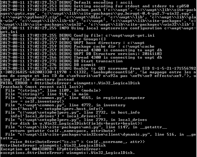 Je ne vois pas ce qui cloche ?? Christophe MOCQUOT Direction des systèmes d'informations christophe.mocquot@auxerre.com ----- Mail original ----- De: "Lesfourmisduweb" <blog@lesfourmisduweb.org> À: wapt@lists.tranquil.it Envoyé: Vendredi 11 Août 2017 16:39:55 Objet: Re: [Wapt] Probleme inscription PC sur Serveur Bonjour Oui vous pouvez faire un wapt-get register -ldebug pour voir l'erreur Simon Le 11/08/2017 à 16:31, MOCQUOT Christophe a écrit : Bonjour Je rencontre un petit soucis sur quelque machine en fait elle ne s'enregistre pas sur mon serveur d'admin (plusieur type different dell hp ..) j'ai tenté une desinstallation et reinstall mais rien ni fait elle ne s'enregistre pas sur le serveur Est ce qu 'il y a une methode pour forcer l'inscription ou voir ce qui la bloque ? Merci par avance Christophe MOCQUOT Direction des systèmes d'informations christophe.mocquot@auxerre.com VILLE D'AUXERRE 14, PLACE DE L'HÔTEL DE VILLE BP 700 59 89012 AUXERRE CEDEX WWW.AUXERRE.COM _______________________________________________ WAPT mailing list WAPT@lists.tranquil.it http://lists.tranquil.it/listinfo/wapt _______________________________________________ WAPT mailing list WAPT@lists.tranquil.it http://lists.tranquil.it/listinfo/wapt VILLE D'AUXERRE 14, PLACE DE L'HOTEL DE VILLE BP 700 59 89012 AUXERRE CEDEX WWW.AUXERRE.COM